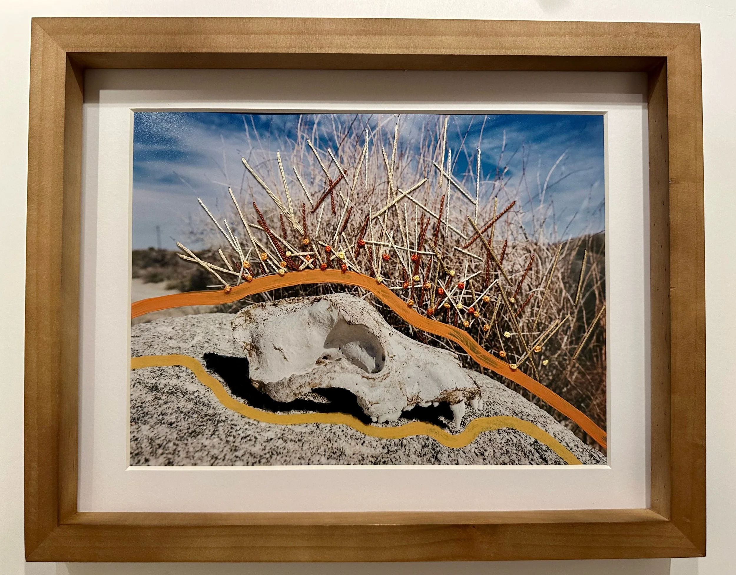 Mixed media: Gouache and embroidery on photo print (Hard to photograph - the black shadow is a basket weave stitch)